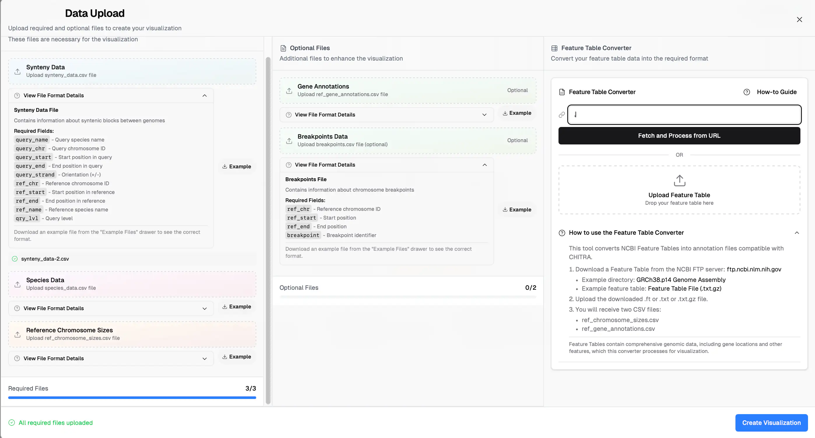Note: Feature Tables contain comprehensive genomic data, including gene locations and other features, which this converter processes for visualization.
