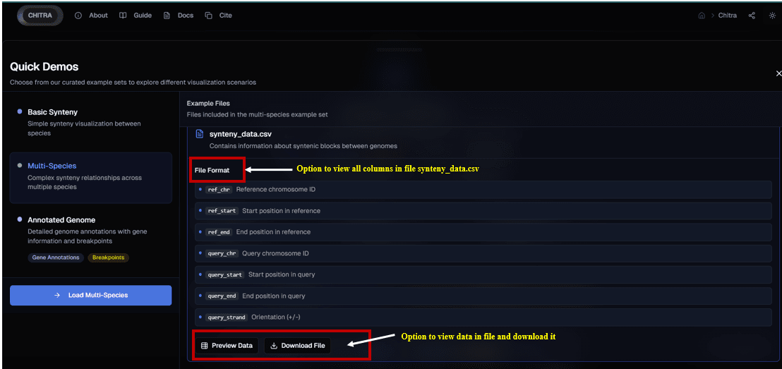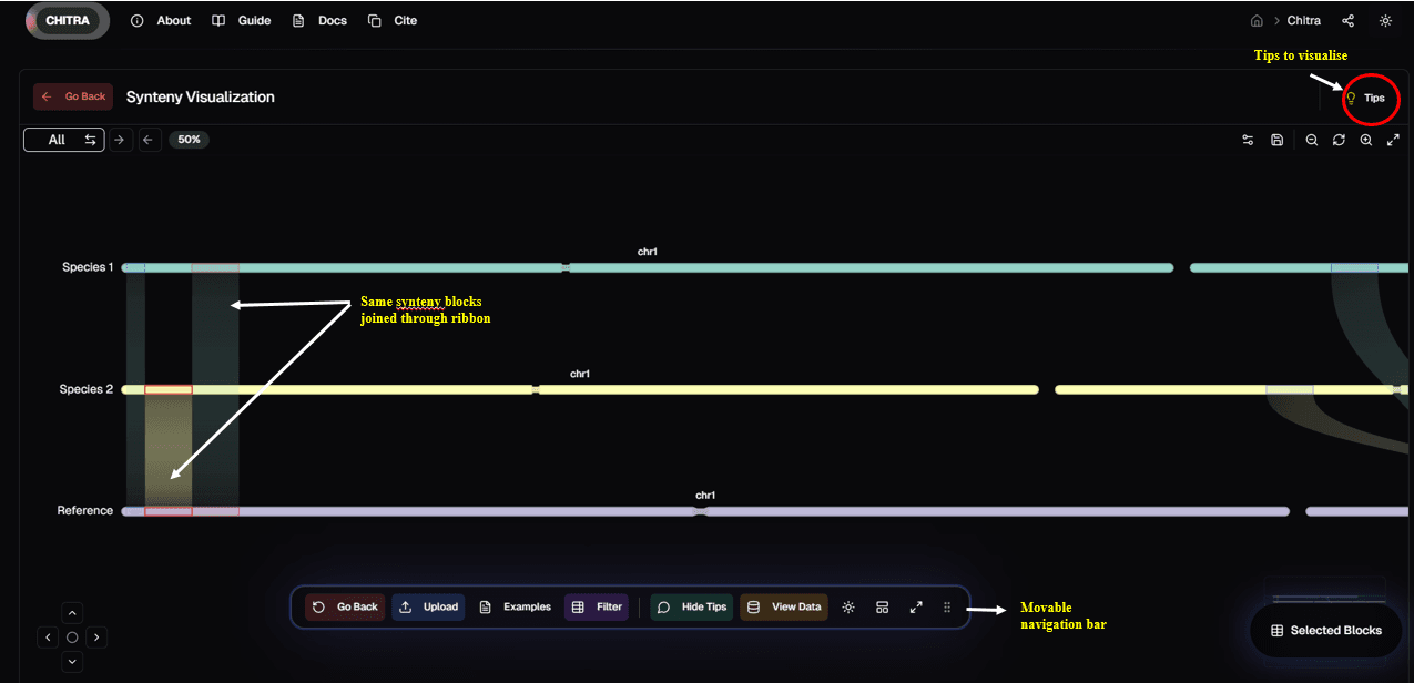 The tool provides an intuitive and user-friendly platform for visualizing genomic data, enabling effective exploration of DNA segments, such as chromosomes, contigs, or scaffolds, across complete genomes. Through interactive features, users can easily identify and analyze synteny blocks (common genomic regions) between species.